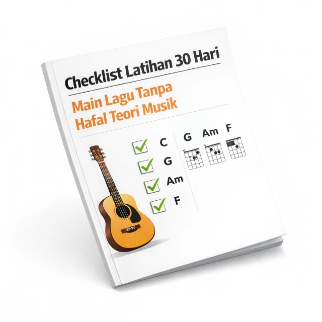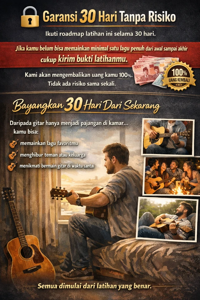 Panduan praktis untuk gitaris pemula yang ingin bisa memainkan lagu favorit hanya dalam 30 hari — tanpa kursus mahal dan tanpa guru privat.